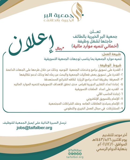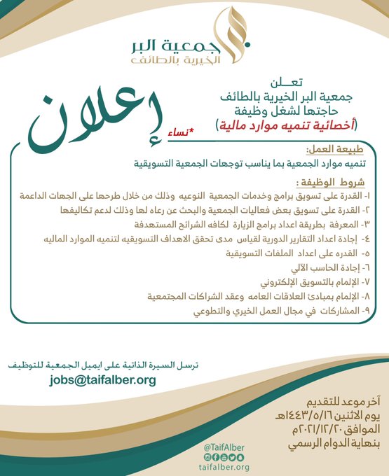 2021-12-19تعلن (جمعية البر الخيرية بالطائف) عبر موقعها الرسمي ( تويتر ) عن توفر وظائف إدارية شاغرة للجنسين للعمل في (الطائف)، واشترطت ان يكون المتقدم سعودي الجنسية، وذلك وفقاً للتفاصيل والشروط الآتية.