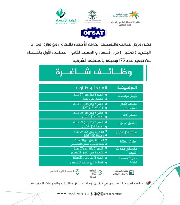 وظيفتك عليناتعلن (غرفة الأحساء) عبر حسابها الرسمي ( تويتر ) بالتعاون مع وزارة الموارد البشرية (تمكين) فرع الأحساء والمعهد الثانوي الصناعي الأول بالأحساء عن توفير عدد 175 وظيفة بالمنطقة الشرقية، وذلك وفقاً للتفاصيل والشروط الآتية.