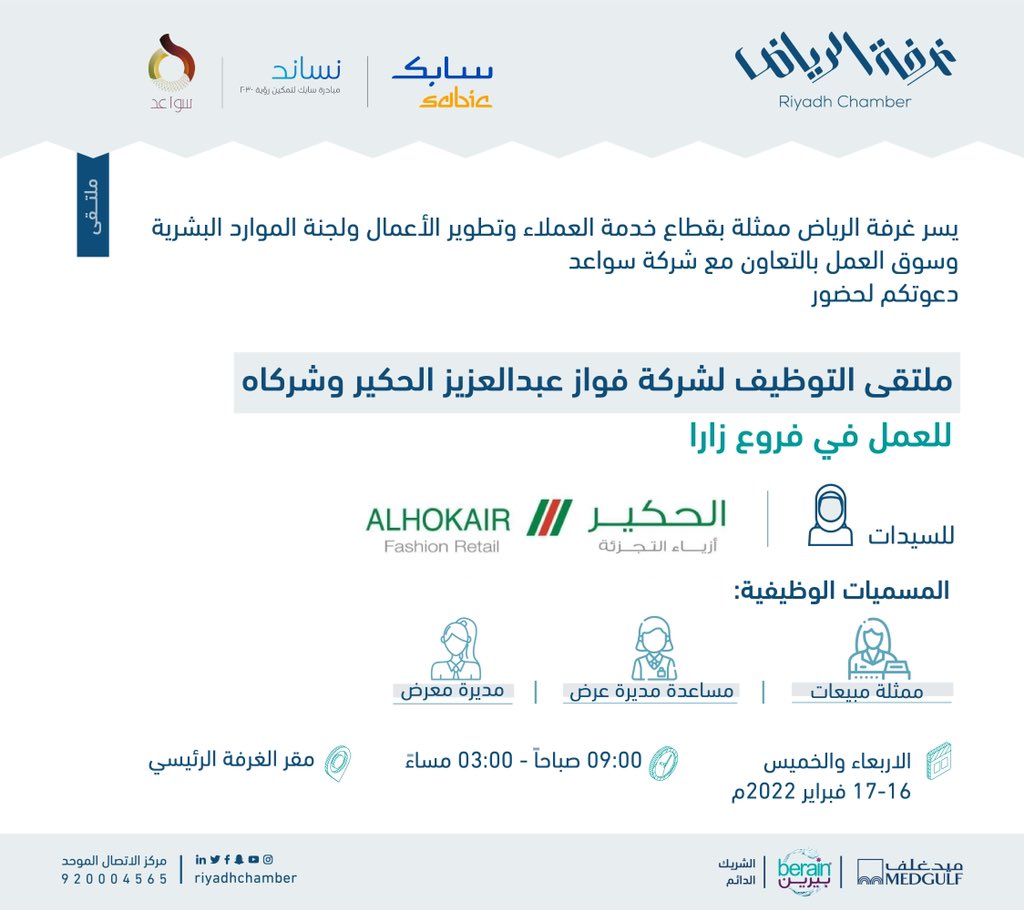 غرفة الرياض تعلن عن اليوم المفتوح للتوظيف للعمل بفروع شركة زارا بعدة مجمعات تجارية