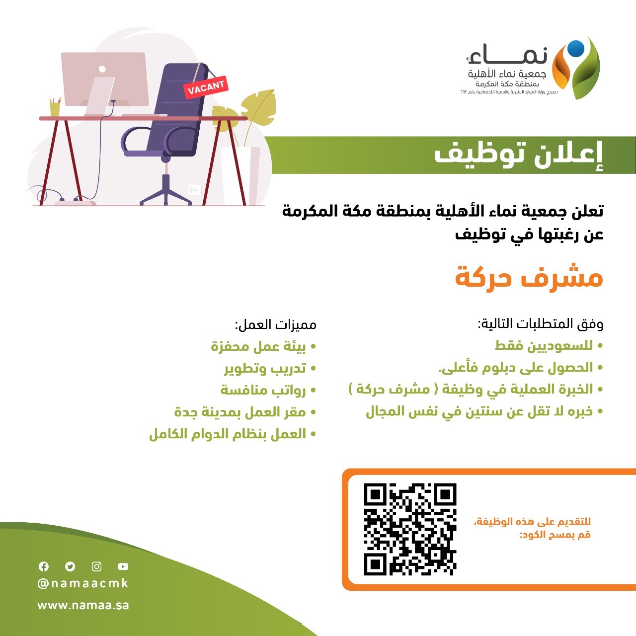 جمعية نماءتعلن (جمعية نماء الأهلية ) عبر حسابها الرسمي ( تويتر ) عن توفر وظائف شاغرة لحملة الدبلوم فما فوق للعمل في ( مكة المكرمة )، واشترطت ان يكون المتقدم سعودي الجنسية، وذلك وفقاً للتفاصيل والشروط الآتية.