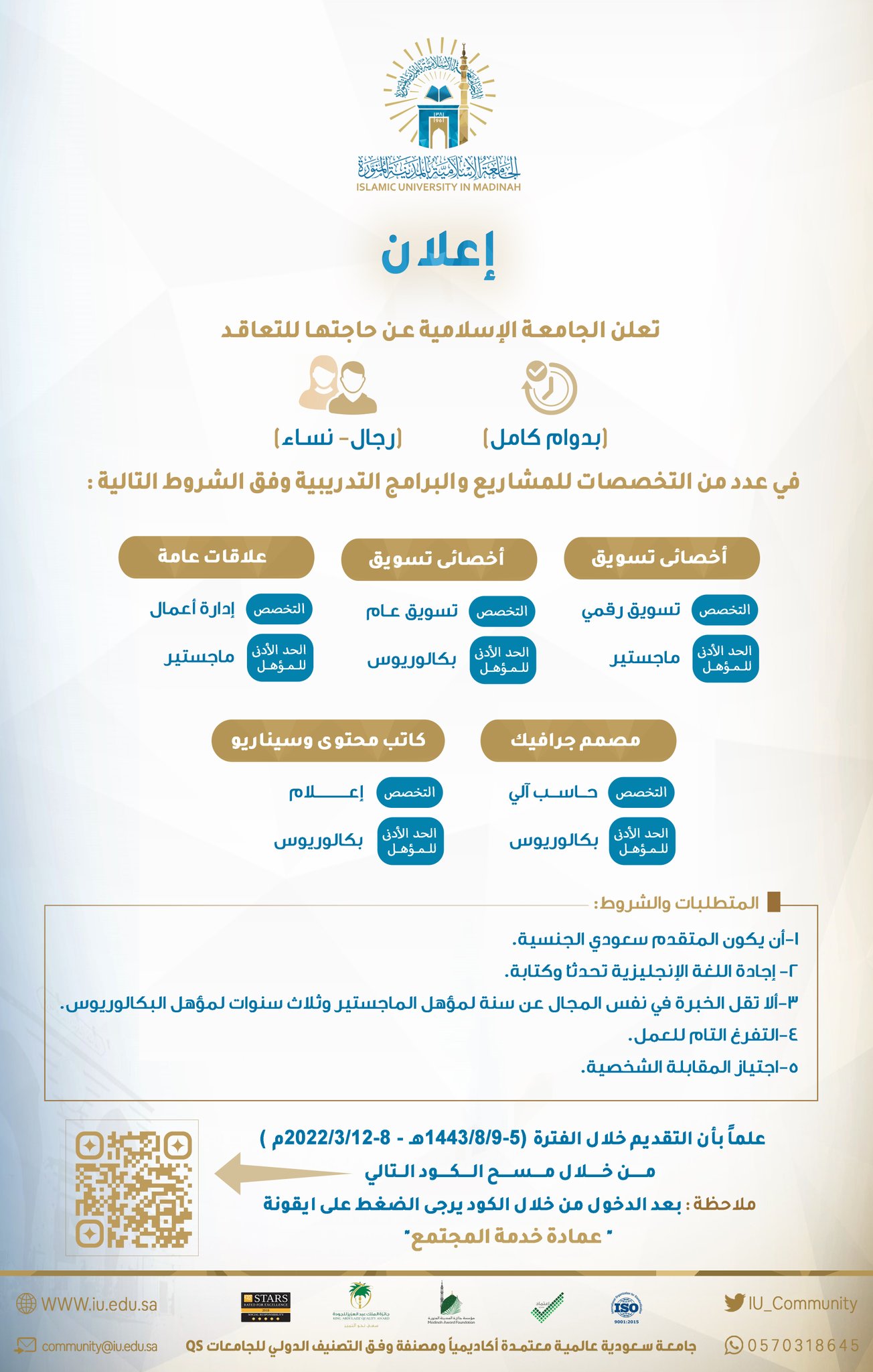 تعلن ( الجامعة الإسلامية ) عبر حسابها الرسمي ( تويتر ) عن عن حاجتها للتعاقد(رجال - نساء)في عدد من التخصصات للمشاريع والبرامج التدريبية وفق الشروط الموضحة ، واشترطت ان يكون المتقدم سعودي الجنسية، وذلك وفقاً للتفاصيل والشروط الآتية.