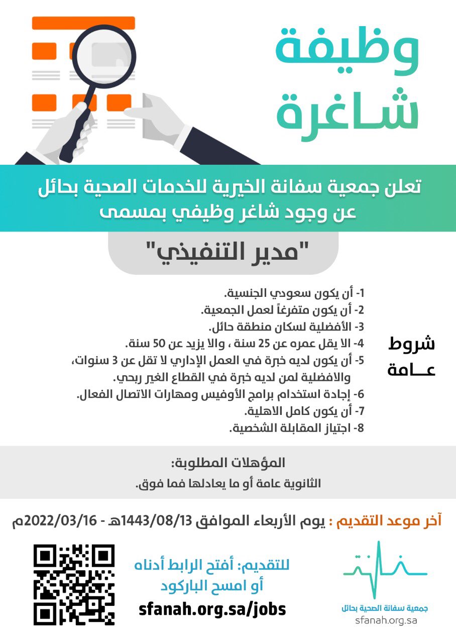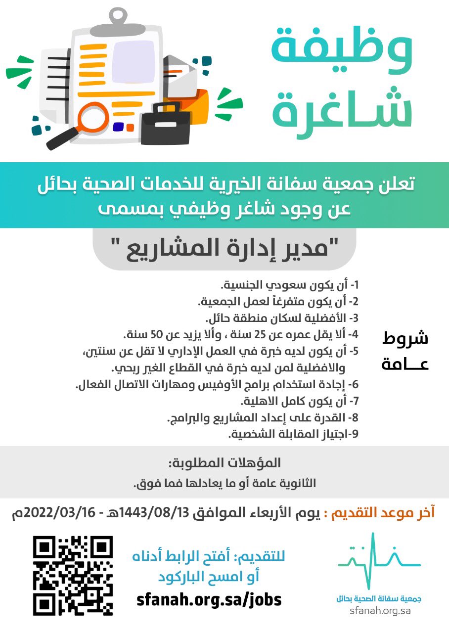 جمعية سفانة الصحيةتعلن (جمعية سفانة الخيرية ) عبر حسابها الرسمي ( تويتر ) عن توفر وظائف إدارية شاغرة لحملة الثانوية فما فوق للعمل في ( حائل )، واشترطت ان يكون المتقدم سعودي الجنسية، وذلك وفقاً للتفاصيل والشروط الآتية.