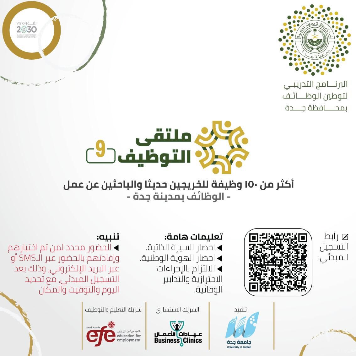 محافظة جدة تعلن أكثر من 150 وظيفة لحملة الثانوية فأعلىى عبر ملتقى التوظيف 9